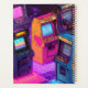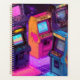 Un groupe de machines à arcades vintages est éclairé par des néons vibrants. La scène se déroule sur fond de galaxie étoilée, créant une atmosphère nostalgique mais futuriste.