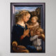 Cette peinture est exposée au musée des Offices. Il montre une Vierge en prière Marie. Deux anges tiennent l'enfant Jésus devant Marie. Marie et Jésus semblent tous deux perdus dans leurs pensées. Marie est représentée d'une manière très élégante par rapport aux peintures antérieures. Par exemple, regardez son expression faciale douce et les voiles et perles gracieuses dans ses cheveux. Remarquez aussi l'halo au-dessus des têtes de Marie et de Jésus. Ces halos ne sont qu'un cercle simple et marquent la transition entre les disques d'or massif utilisés dans les travaux antérieurs et la disparition de l'halo dans les peintures de la Renaissance ultérieure. L'ange à droite semble se moquer et regarder le spectateur directement dans les yeux. Marie, Jésus et les anges sont représentés devant une fenêtre, ce qui peut facilement être confondu avec le cadre de ce tableau. Dans l'arrière - plan, on découvre un paysage inspiré des peintures flamandes. Des informations plus détaillées sur ce tableau peuvent être trouvées à l'adresse https://www.tripimprover.com/blog/madonna-with-child-and-two-angels-by-filippo-lippi.