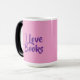 This Morphing Mug displays the words I Love Books. The I Love Books text is on both sides of the mug in purple text. The background of the mug is a pretty pink color. This mug is a Book Lovers Mug. The morphing mug shows the I Love books purple text and pink background when you put a hot drink in the mug. The image is on both sides of the mug. The mug is a fifteen ounce morphing mug.