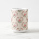 This mug features a repeating pattern design of red watercolor hearts with green leaves and pink floral elements on a cream-colored background. Each heart is painted in a glossy, three-dimensional style with subtle shading and sits at the center of a decorative vine arrangement. The vines are composed of small pink flowers and sage green leaves arranged in a symmetrical pattern. The leaves are detailed with fine lines showing their individual shapes and textures. The mug is a morphing mug. When you put a hot drink in the mug the image is visible. The image is on both sides of the mug. The mug is a fifteen-ounce mug.