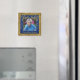 Cet aimant modèle photo floral bleu et or est personnalisé avec le nom de votre être aimé, leur année de naissance et de mort, et les mots "Pour toujours dans nos coeurs" en haut.