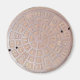 Couvre-trou en fer utilisé par la compagnie de services publics. Le design est des cercles concentriques divisés en segments de tarte, avec des lettres.
