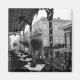 Image en noir et blanc du balcon du Royal Cafe dans le quartier français de la Nouvelle-Orléans. Les gens s'entassent sous les vitrines pour sortir de la pluie battante.