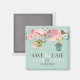 Belles illustrations de deux tourterelles perchées sur une branche capricieuse avec des fleurs variées. Ceci économise l'aimant de date est parfait pour un mariage d'été ou de printemps.