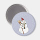 Joyeux bonhomme de neige portant un chapeau santa avec de la neige flottant autour de lui.