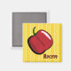 Un piment de rocoto rouge est décoré de motifs inspirés des textiles colorés du Pérou et est posé sur un arrière - plan jaune avec une version plus petite du même motif et un étiquette de script dans le coin. Ce poivre épicé est consommé au Pérou et en Bolivie et a été cultivé dans la région depuis l'époque pré-indienne.