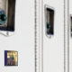 Une des trois choses jaune : regarder par une fenêtre un vase de tulipes, trois femmes en robes colorées, et un arc-en-ciel muet sur un arrière - plan de boîtes jaunes.