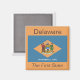 Une image authentique et de qualité du drapeau du Delaware placé entre le nom de l'Etat et le surnom sur un arrière - plan clair couleur drapeau.