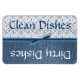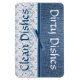 Pratique et élégant, propre / sale lave-vaisselle aimant fait dans un look denim bleu, à une extrémité, et un look dentelle blanche, à l'extrémité opposée de l'aimant. Les graphiques d'un ruban bleu décorent le milieu de l'aimant et les textes bleus et blancs, Plats propres et Plats salés, à l'autre extrémité. Super petite idée cadeau pour n'importe qui.