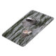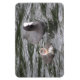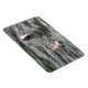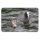 Cet aimant impressionnant présente une photo d'une Pied et de sa poussette nageant sur une rivière marémotrice. La femelle est grise avec un patch blanc sur la tête et les yeux rouges, tandis que la petite poussette moelleuse est gris pâle avec un front blanc.