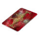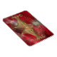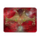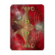 Un visage de chat stylisé fait de courbes et de courbes dorées, avec de grands yeux vert-or, contre un arrière - plan fractal rouge.