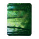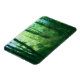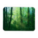 Les rayons du soleil matinal se répandent dans une forêt estivale d'une verdure éclatante, avec des arbres massifs recouverts de lierre et une épaisse couverture de sous-bois. Une photographie numériquement manipulée pour donner aux feuilles de la vigne, de la brume bleu-vert, des rayons dorés et des arbres verts printaniers une qualité de rêve.