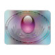 Un décor bleu pastel, lavande et rose avec un oeuf rose translucide dans un cadre argenté, entouré d'un cadre ovale argenté clair et composé de quatre pierres précieuses plus lisses comme des oeufs colorés.