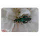Cet impressionnant aimant présente une photo d'une espèce britannique de coléoptère à l'huile de couleur verte bleutée, assise sur une fleur de Carnation blanche. La photo a été prise en utilisant la macro photographie pour montrer le détail et la couleur de cette belle espèce de coléoptères.