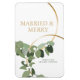 Avec mon illustration verte d'eucalyptus avec anneaux dorés, cette carte magnétique de Noël Marié et Joyeux Fêtes peut être facilement customisée avec les nouveaux noms MR et MRS. Couleur accent verte.