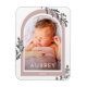 Le design simple et moderne présente des branches botaniques grises avec une arche photo rose féminine et un nom en joli script. L'année est simplement indiquée dans la typographie blanche. Parfait pour célébrer un nouveau-né ou afficher une photo spéciale.