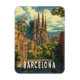 Affiche de voyage colorée et animée présentant l'emblématique Sagrada Familia à Barcelone. Conçu dans un style d'art vectoriel plat avec des tons pastel et des blocs de couleurs audacieux. Idéal pour les amateurs de décoration familiale ou de voyage.