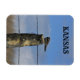 Une photo d'un faucon de nuit du Kansas dormant sur un poste de calcaire avec ciel bleu, nuages, barbelés et herbe, à l'ouest du lac Wilson au sud de Lucas Kansas. C'est sur un MAGNET Carré.
