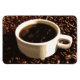 Cet aimant flexible affiche une tasse de café fraîchement moulu à la vapeur, blanc, sur un lit de grains de café rôtis brun foncé.