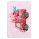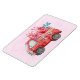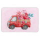 Un aimant flexible avec un camion d'aquarelle rouge mignon. Portant des coeurs et des fleurs à l'arrière. Je t'aime, écrit sur le côté. Whimsical et adorable. Arrière - plan à motif rose clair.