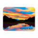 Un canot traversant un lac de montagne reflétant les belles oranges et les bleus d'un coucher de soleil coloré. Ajoutez votre propre texte.