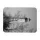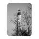 This is a black and white photo of the Cape May Lighthouse. Known to locals as Cape May Light, c'est located dans le sud du New Jersey, dans le Cape May Point State Park. The Lighthouse is at the very tip of South Jersey and serves as a beacon to incoming ships. This scenic photo taken in winter, and the lighthouse can be through the branches of trees in the foreground. The Lighthouse is a NJ landmark, a Cape May Tourist Traction, and a beautiful piece of architecture.