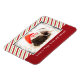 Un aimant flexible avec une adorable photo d'un chiot carlin qui dort en portant un chapeau santa. Joyeux Noël est écrit sur la bande de son casquette, dans une police manuscrite branchée. Une bordure grinçante avec des lumières de Noël colorées entoure le cadre de cette jolie photo. L'arrière - plan est un motif à rayures sucre de canne festif en rouge blanc et vert. Personnalisez avec votre nom. La ligne de signature dit : Amour et Carlins, avec votre nom.