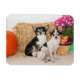 Portrait d'automne de deux chihuahua. L'un est noir et blanc avec des marques tan et l'autre est blanc avec des marques noires et tan. Ces chihuahua's posent bien avec une scène d'automne contenant une caution de foin, une maman, des pommes dans un panier, et un citrouille. Cette image a été prise par Debbie Quick of Debs Creative Images. Pour voir d'autres photographies de Debbie, visitez son site Web à l'adresse suivante : www.debscreativeimages.com