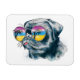 Ce design présente un carlin qui regarde à travers des lunettes de soleil sur une scène tropicale.