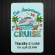 Tropical cruise anniversary design featuring a ship, palm trees, and floral accents. Personalized anniversary stateroom door marker with names and date for a romantic celebration. Please note: Not all ship's doors are magnetic. We cannot guarantee your door will be magnetic. Please check with your travel agent, the cruise line, or via forums.