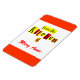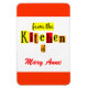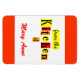 Un rétro personnalisé "From the Kitchen of" avec script et de jolies lettres kitsch en noir contre des blocs de couleur rouge, orange et jaune, avec des bordures de dessus et de fond rouges.