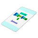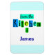 Un rétro personnalisé "From the Kitchen of" avec script et de jolies lettres kitsch en noir contre des blocs de couleur de bleu, vert et turquoise, avec des bordures turquoise clair dessus et bas.
