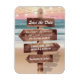 Aimants de mariage en bord de mer romantiques avec une plage de sable luxuriante au coucher du soleil, des guirlandes lumineuses et votre texte écrit sur un panneau indicateur en bois rustique.