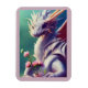 Cet adorable aimant montre un dragon mythique blanc tenant un bouquet de fleurs roses.