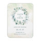 Élégant, enregistrez l'aimant dateur avec une couronne composée de feuilles d'eucalyptus et de verdure avec une pointe de bleu. Voici vos détails mariages en vert foncé sur un lave pastel aquarelle avec des taches de parties scintillant faux or. Ce design simple et rustique est idéal pour un mariage à thème botanique en été.