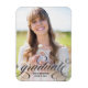 Cet élégant aimant faire-part de graduation présente une jolie calligraphie noire et une grande photo. L'écriture noire qui recouvre le bas indique "Graduate" en lettres minuscules décorées d'élégants fleuris. Customisez avec le nom du diplômé et l'année de graduation sous la conception de la typographie.