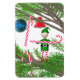 Aimant avec mon image d'un petit elfe mignon habillé en rouge et vert mettant des sucres de canne sur un sapin de Noël.