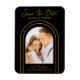 Save The Date Black Gold Stylish Script Art Déco Mariage Magnet présente votre photo préférée dans une arche dorée sur un arrière - plan noir. Personnalisez avec votre texte en modifiant le texte dans les zones de texte fournies. Conçu pour vous par ©Evco Studio www.zazzle.com/store/evcostudio