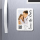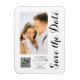 Save The Date Black White Stylish Script Modern Mariage Magnets dispose d'un arrière - plan blanc avec votre photo personnalisée. Personnalisez avec votre texte en modifiant le texte dans les zones de texte fournies et ajoutez l'URL de votre site Web pour votre code QR personnalisé. Conçu pour vous par ©Evco Studio www.zazzle.com/store/evcostudio