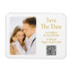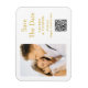 Save The Date Gold White Stylish Script Modern Mariage Magnets dispose d'un arrière - plan blanc avec votre photo personnalisée. Personnalisez avec votre texte en modifiant le texte dans les zones de texte fournies et ajoutez l'URL de votre site Web pour votre code QR personnalisé. Conçu pour vous par ©Evco Studio www.zazzle.com/store/evcostudio