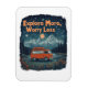 A classic scene of a camper van parked by a mountain lake, pine trees, and stars above. The phrase "Explore More, Worry Less" arches along the top, in well-worn, retro lettering for a relaxed, adventurous look.