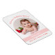 Magnét photo personnalisé tendance et élégant pour une petite fille, flexible, à utiliser en remplacement d'une annonce de naissance sur papier pour un parrain. Il comprend un cadre blanc avec une ouverture ronde pour une photo horizontale personnalisée, les informations de naissance du bébé et un bandeau rose incurvé sur lequel apparaissent les premier et deuxième prénoms (ou prénom et nom de famille) de la petite, dans une police / typographie élégante. Ce design comprend les mots "Je t'aime, parrain Jason !", que vous pouvez personnaliser, bien sûr.