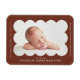 Aimant de faire-part de naissance moderne comportant la photo de votre bébé nichée dans un cadre marron à bordure ondulée. Personnalisez l'aimant de faire-part de naissance marron en ajoutant le nom de votre bébé et des informations supplémentaires en lettrage blanc.