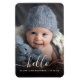 Célébrez l'arrivée du dernier membre de votre famille avec cet aimant flexible souvenir, avec le mot "bonjour" en élégante écriture manuscrite avec des fioritures au début et à la fin. Personnalisez-le avec le nom et la date de naissance de bébé, et remplacez l'image exemple par votre photo préférée de bébé. Un filtre dégradé noir aide à faire ressortir le texte.