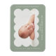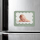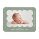 Un aimant de faire-part de naissance moderne présentant la photo de votre bébé nichée à l'intérieur d'un cadre à festons vert sauge. Personnalisez l'aimant de faire-part de naissance vert sauge en ajoutant le nom de votre bébé et des informations supplémentaires en lettrage blanc.