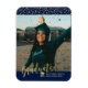 Partagez votre fête spéciale avec votre famille et vos amis. Cet aimant de graduation moderne présente un script d'or élégant "Graduate" et des confettis sur un arrière - plan bleu marine. Vous pouvez personnaliser le texte et les photos. Des fournitures et des cadeaux de fête correspondants sont disponibles dans mon magasin BaraBomDesign.
