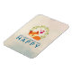 Un aimant avec un dessin animé d'un mignon renard orange dormant paisiblement avec de petits cœurs rouges. Une couronne de feuillage vert derrière. Le texte dit : "Fais ce qui te rend heureux". Un fond couleur crème rustique avec un motif tendance de formes géométriques faibles.
