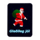 Crois-tu en Père Noël ? Image d'un Père Noël rayé, portant un sac vert de cadeaux ; superposée sur un arrière - plan étoilé. Le texte islandais "Gleðileg jól" (Joyeux Noël) apparaît en bleu et blanc éclatant.
