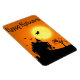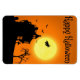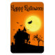 Illustration d'Halloween joyeuse avec un paysage noir éffrayant avec une maison effrayante, un arbre déplaisant, des chauves-souris et une sorcière volant sur son balai ; le tout sur un arrière - plan orange avec la pleine lune brillante.