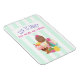 Un aimant flex avec une citation amusante avec l'illustration d'une crème glacée à 3 boules sundae avec des arrosages colorés. Un cône glacé avec des boules de chocolat, fraise et vanille. Un bol de glace néopolite avec une cerise sur le dessus. Des fraises et un ananas sont assis à côté des bols. Motif à rayures vert et blanc à la menthe en arrière - plan.
